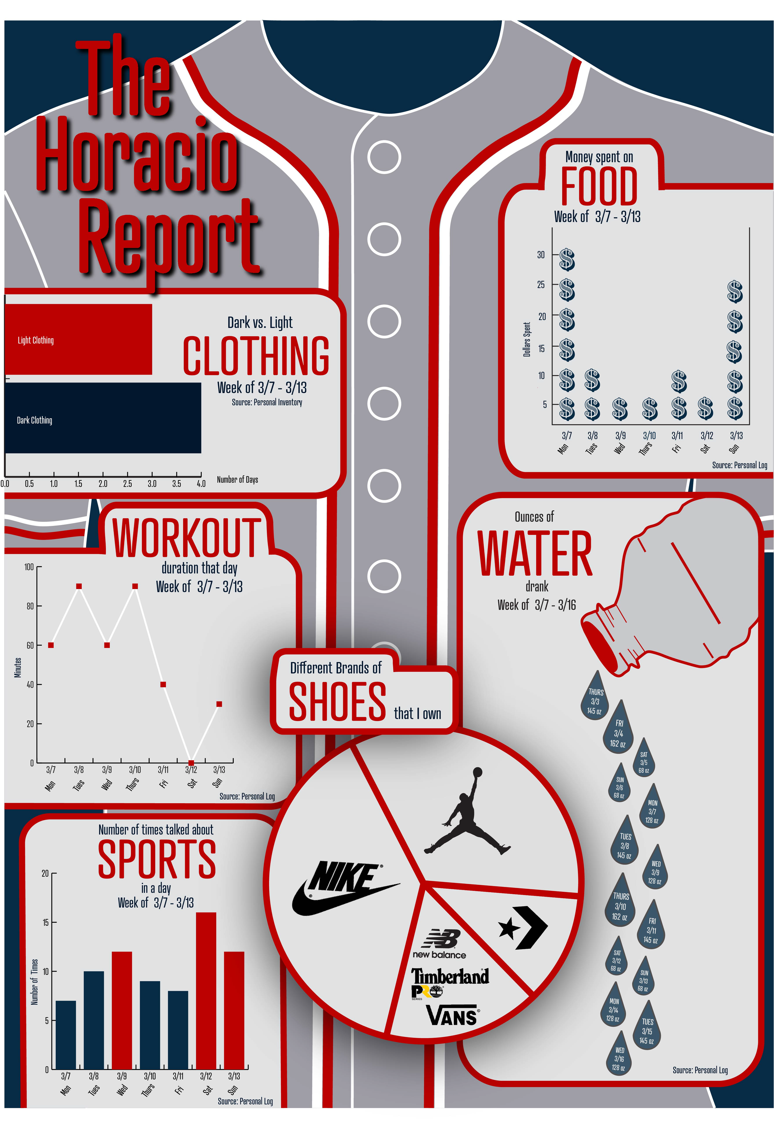 This was a personal report on my everyday life. It consisted of six different graphs representing six different attributes in my life. The whole idea of the project was to personalize a poster that gives an outsider an idea as to who I am as a person.