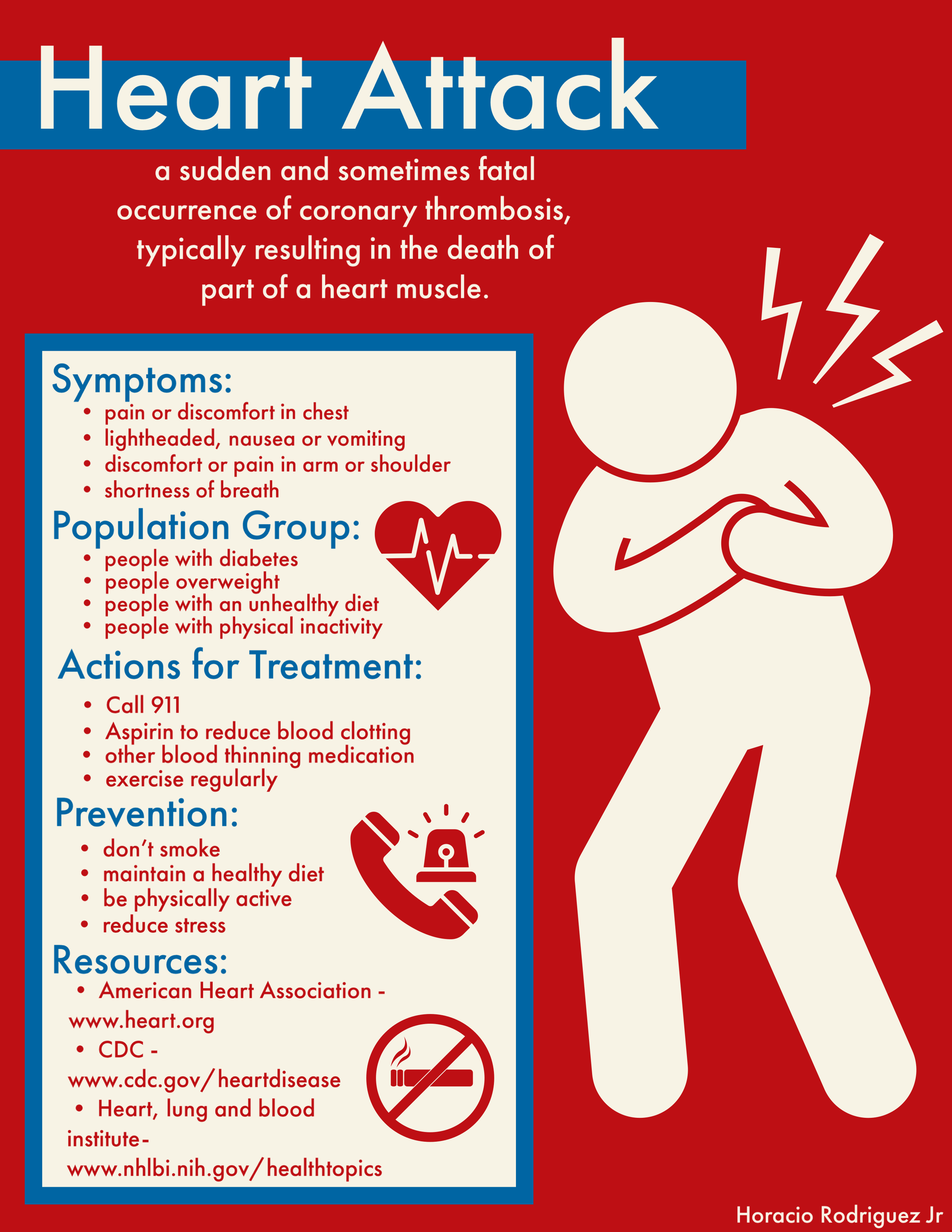 Heart Attack InfographicThe intention of this poster was to show the audience an easy to follow along poster on symptoms, population group, actions for treatment, prevention and resources for a Heart Attack.